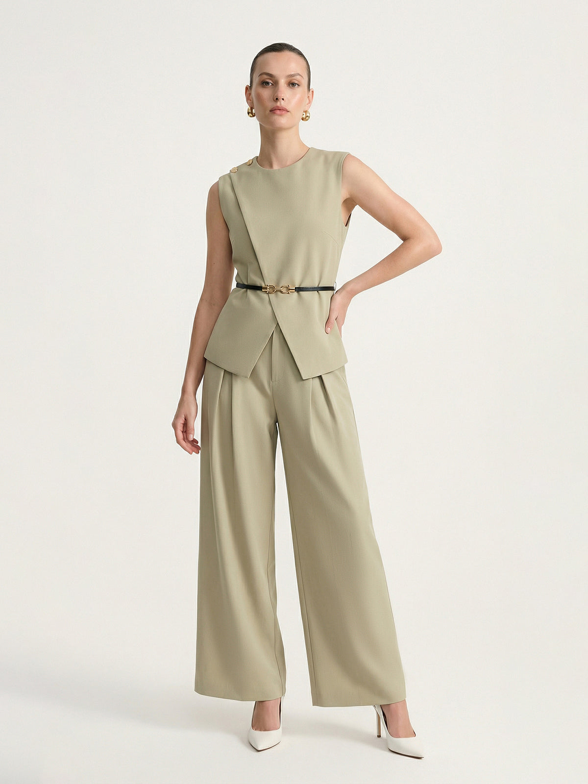Sleeveless Belted Top & Pleated Pants Set