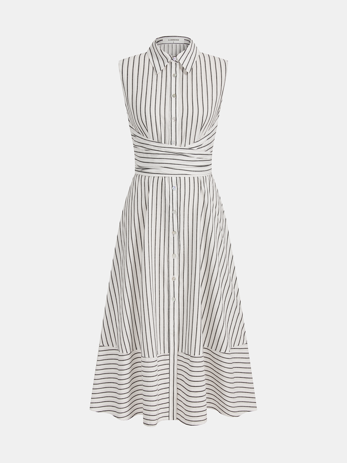 Striped Collared Sleeveless Tie Waist Midi Dress